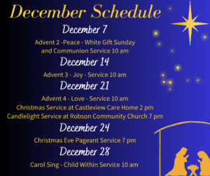 Our Christmas Eve Service is at 7 pm on Wednesday, Dec. 24, 2025. Come join us for an impromptu “Picture Pageant” and lots of singing as well as a candlelight finish to the service.
